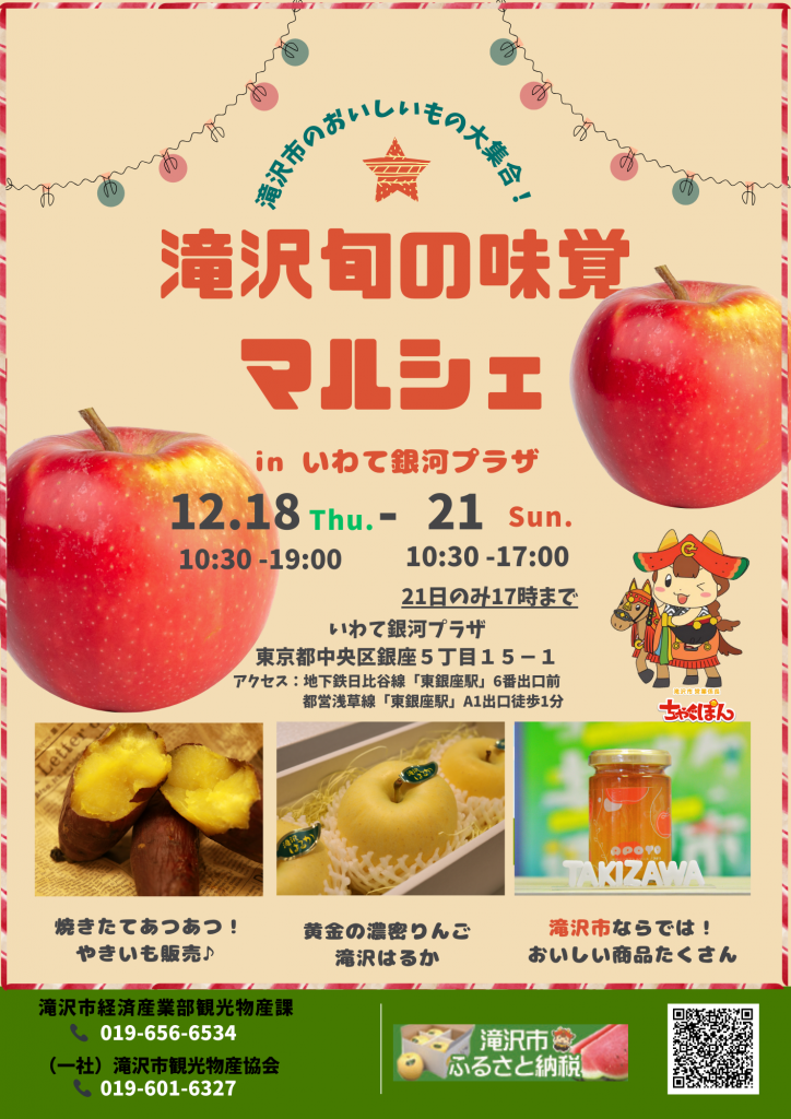 東京銀座にある岩手県のアンテナショップ『いわて銀河プラザ』にて、 12月18日(木)~21日(日)まで『滝沢旬の味覚マルシェ』が開催されます!